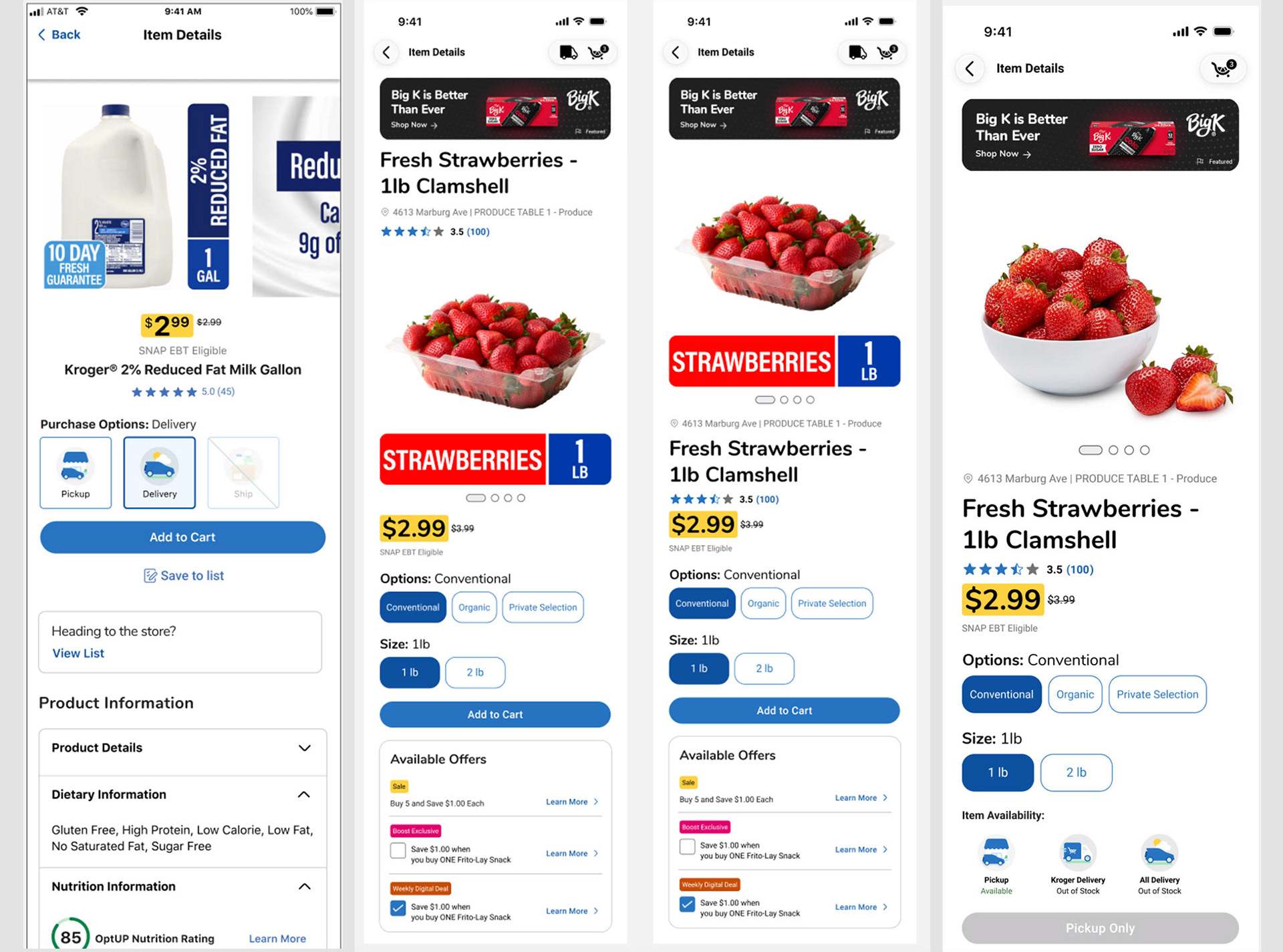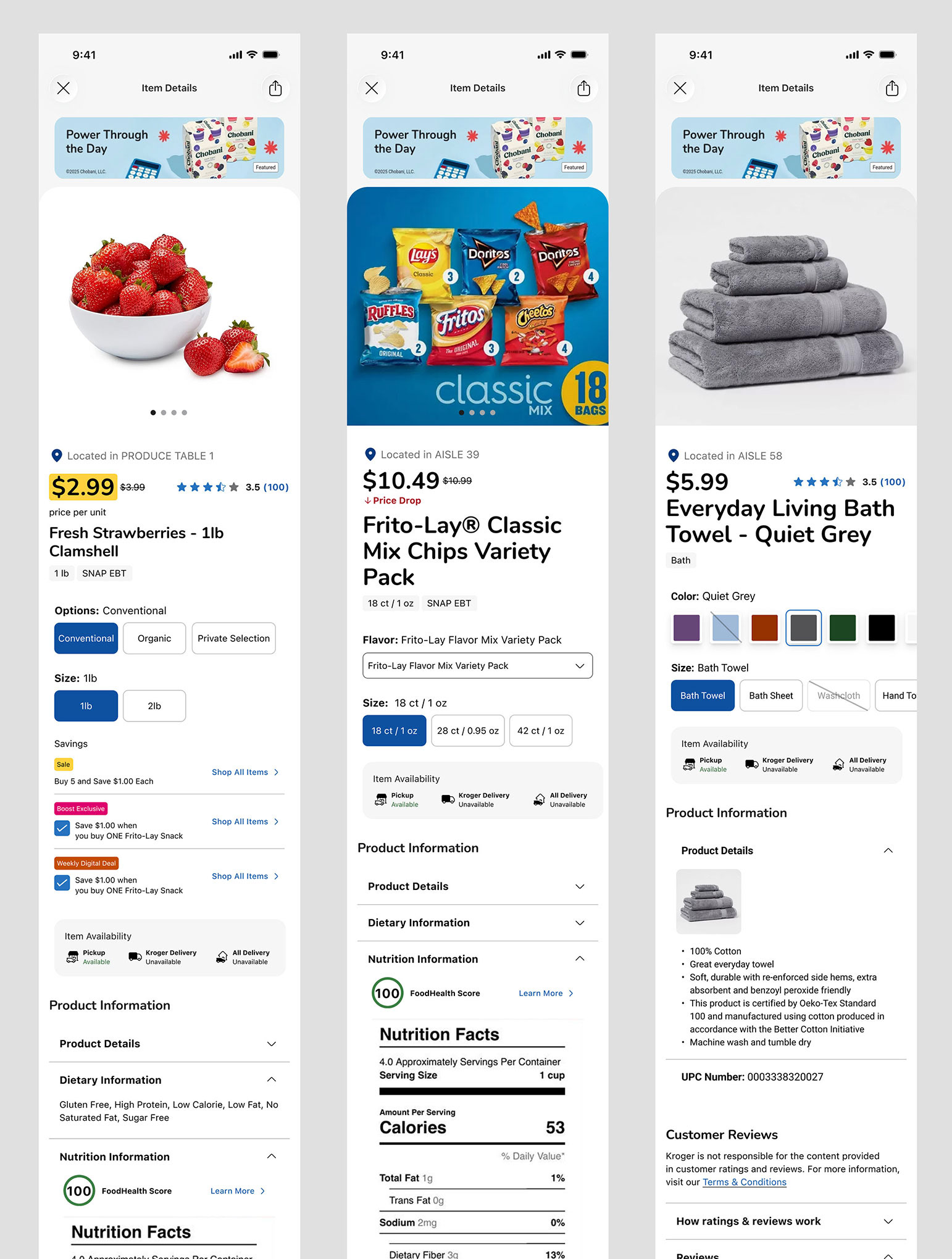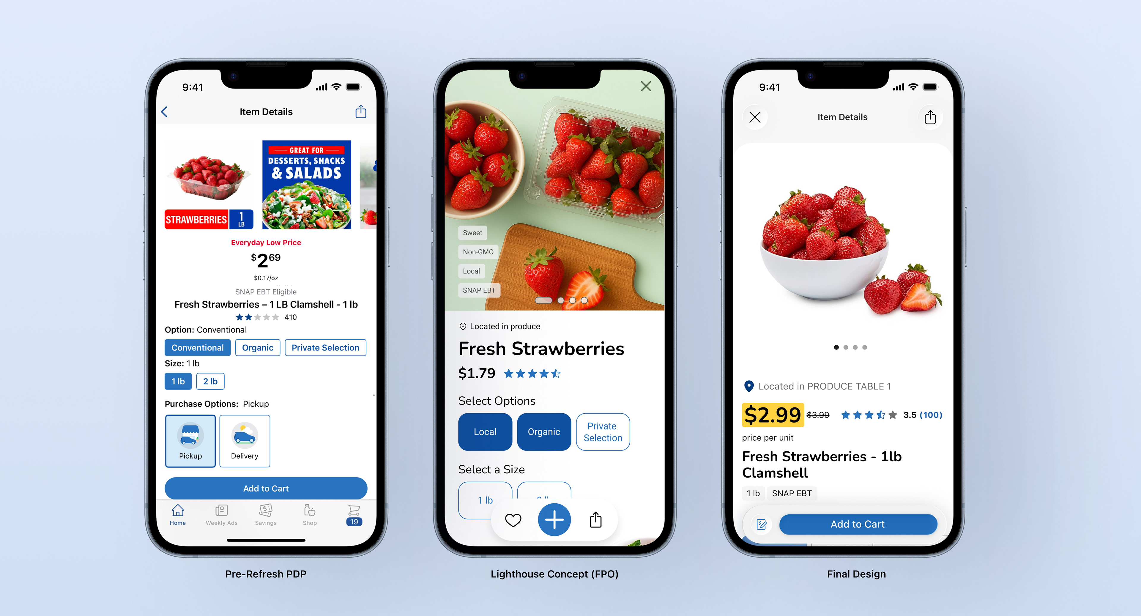 I focused on larger imagery (with the understanding of the upcoming improvements to product imagery), decluttering content, larger tap areas, and a hierarchy that aligned with what customers had traditionally found to be the most important content on our pages.