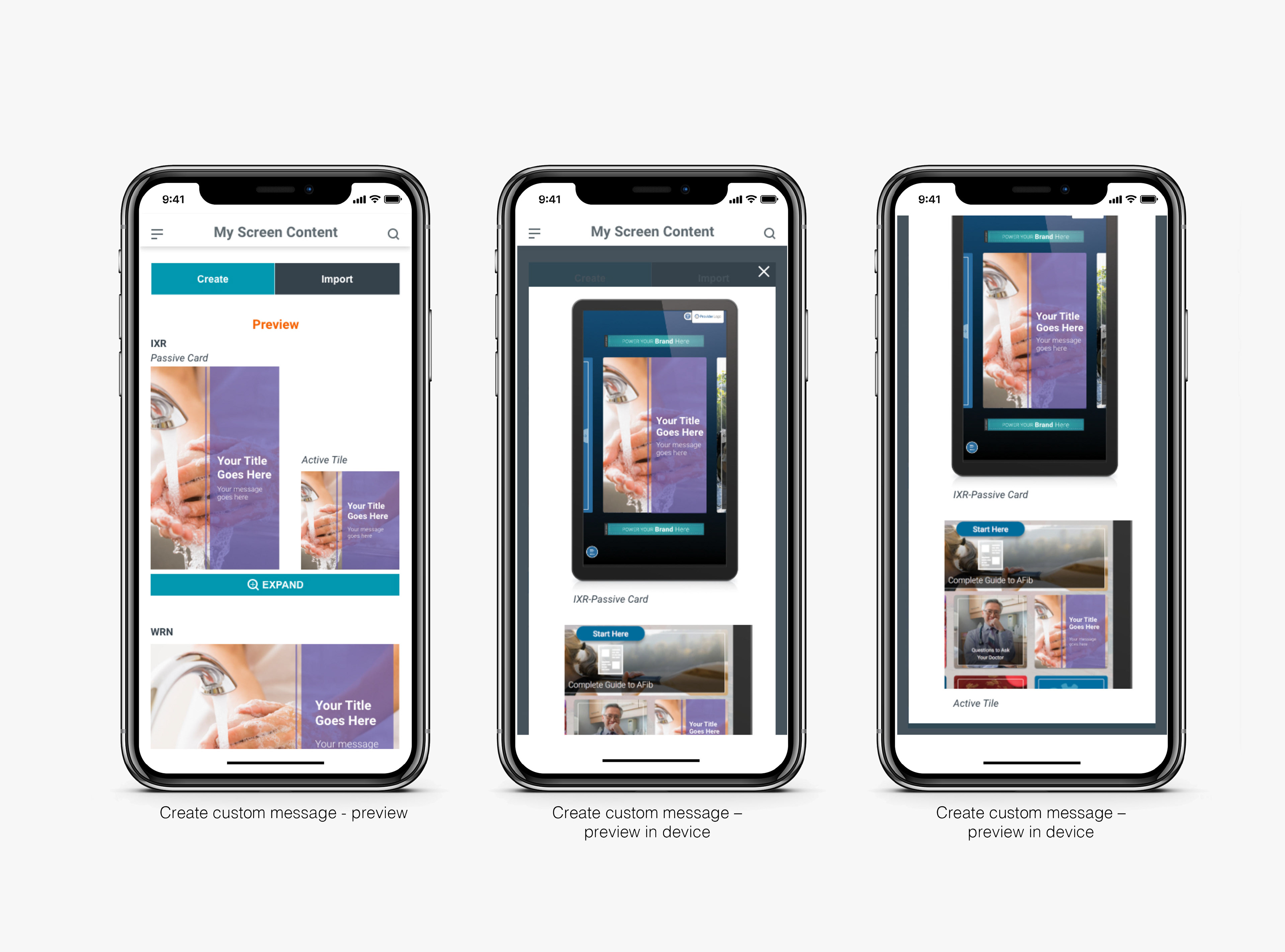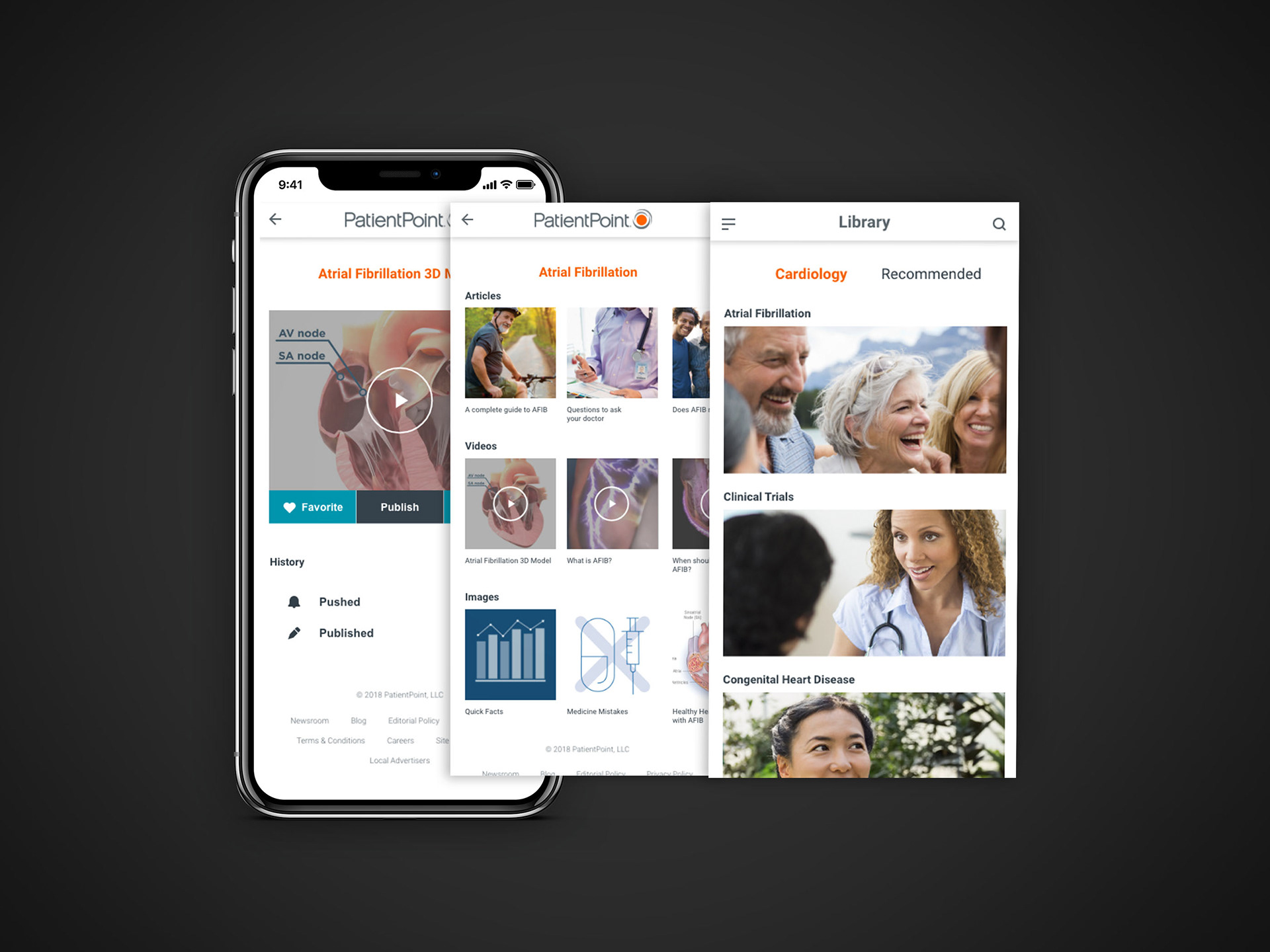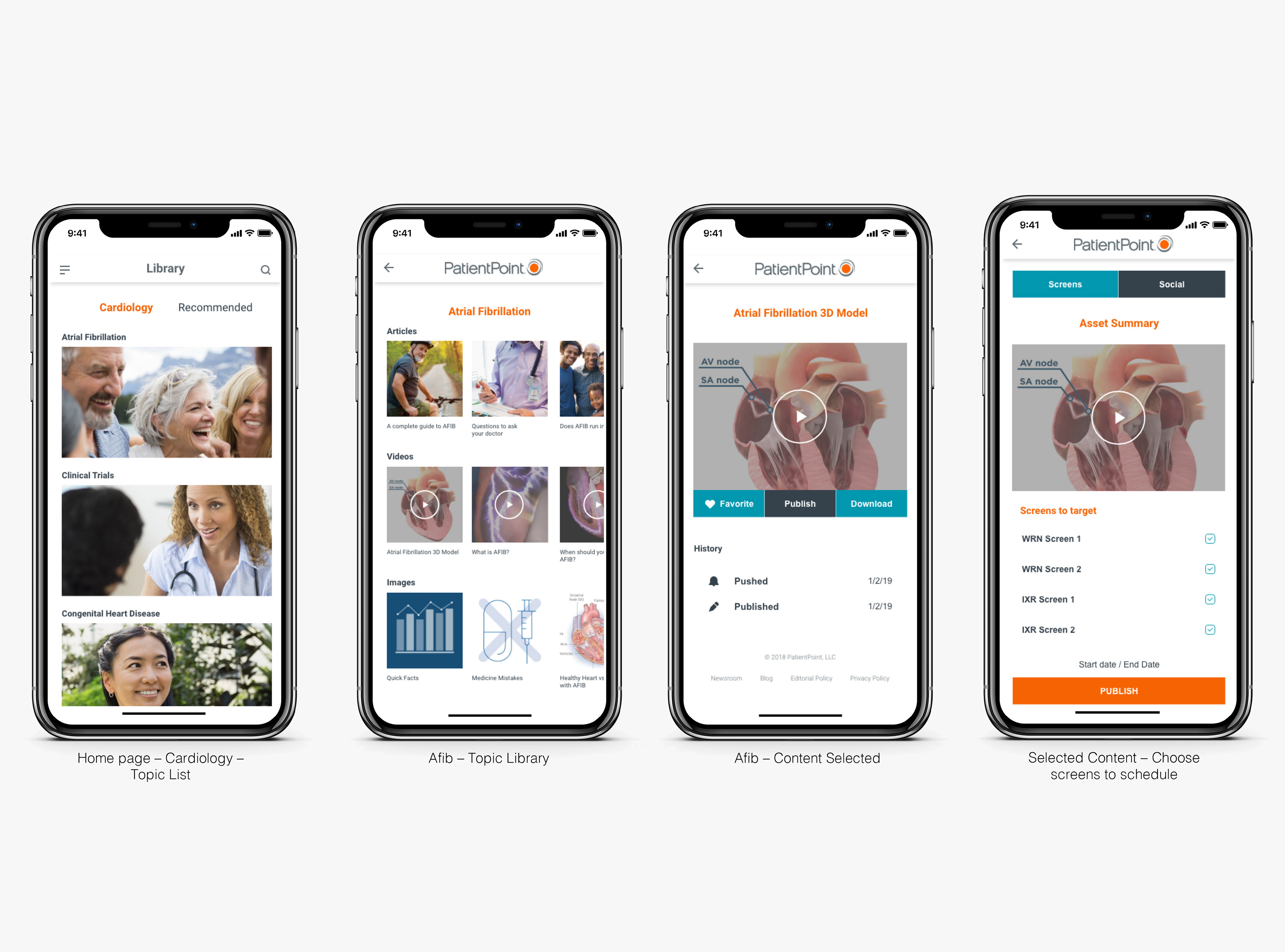 This first walkthrough above shows the landing page for a particular program (cardiology) and its topic list, and shows how the user would navigate when selecting a particular topic and piece of content. Once the content has been selected, the user will have the option to publish the content and select the device to publish it on.