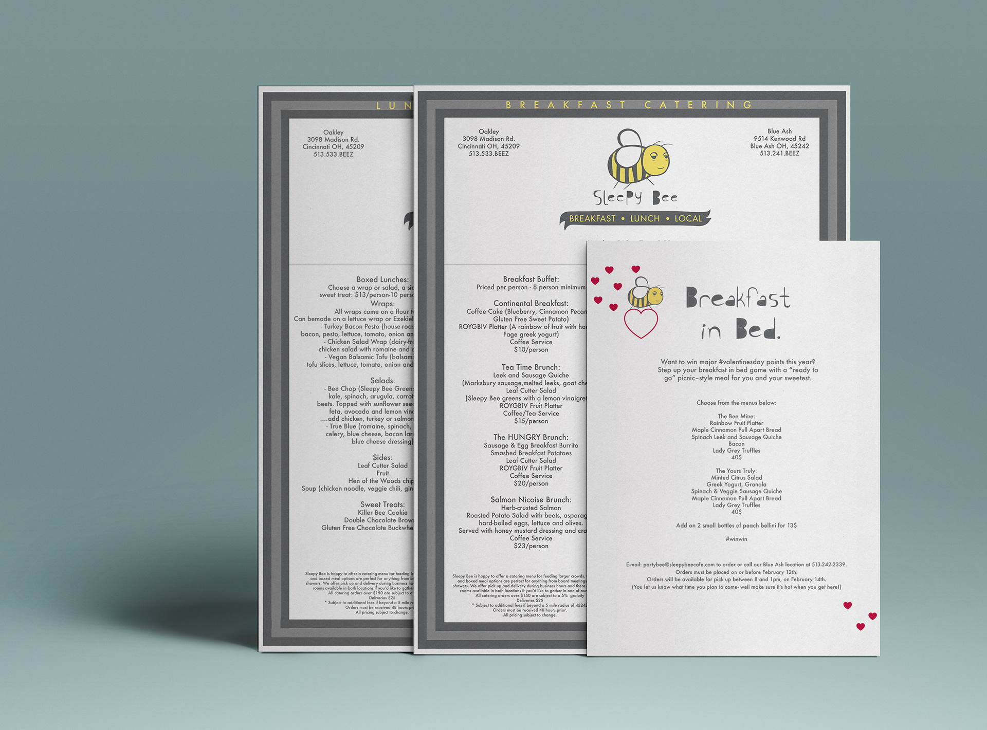 A collection of works I've created for the Sleepy Bee Café in Cincinnati OH when I was their freelancer. Work includes door decals, restaurant signage, t-shirts, and menus/specials