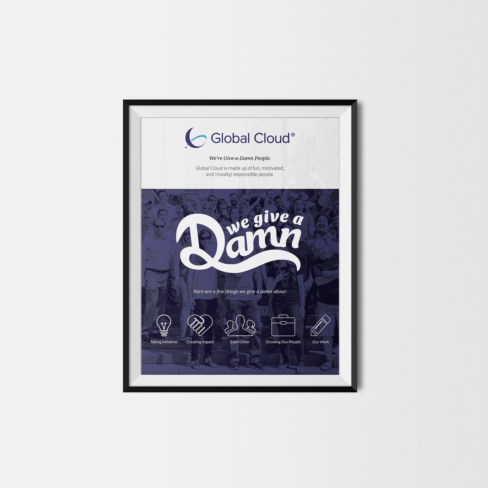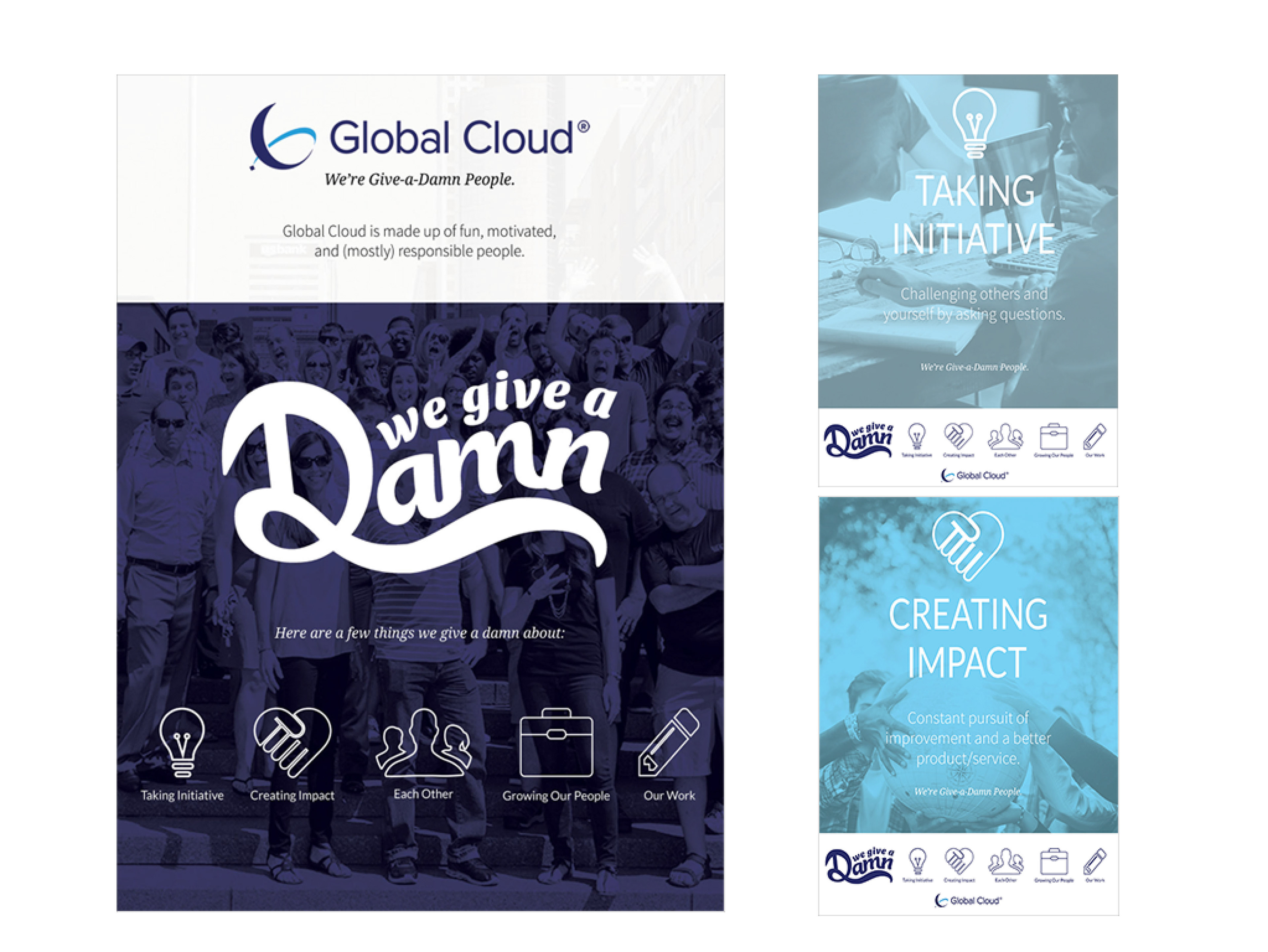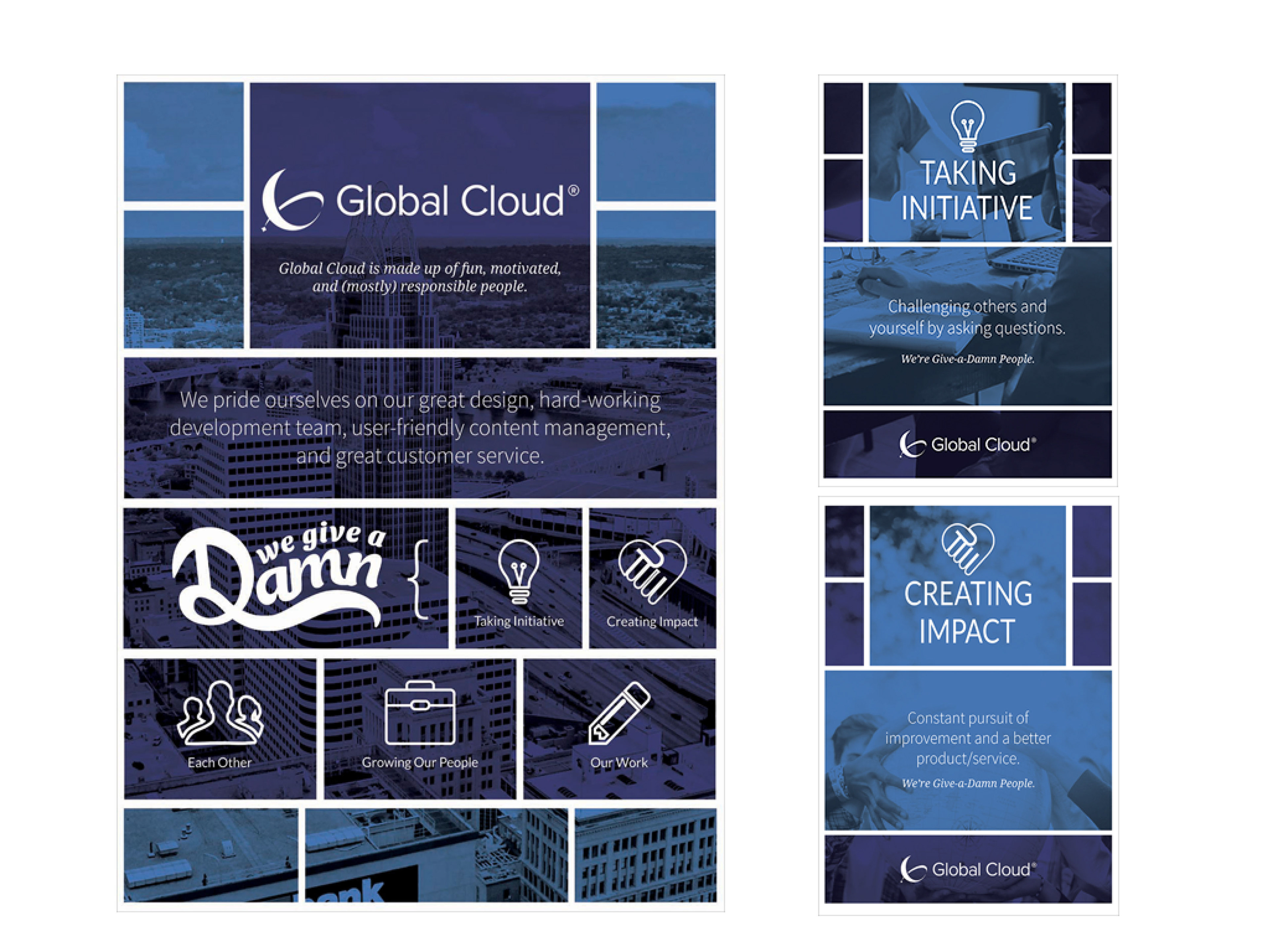 Global Cloud has recently reviewed their mission and values statement and has pulled out key components that relate to who they are as a company. This new Give-a-Damn attitude in relation to their clients and their work has played a large role in their marketing strategy as “Give-a-Damn” people. Re-design the values web and design an entirely new set of company posters for the office space. The values web and poster design should relate to Global Cloud’s newly-designed brand guidelines--mimicking color, type, imagery, and overall esthetic. The Give-a-Damn posters should primarily focus in on their values while still calling attention to their slogan statement. The re-designed values web will be placed on the website and posters will be printed and hung up in the upstairs office space.