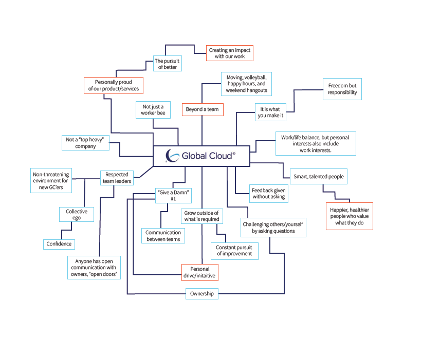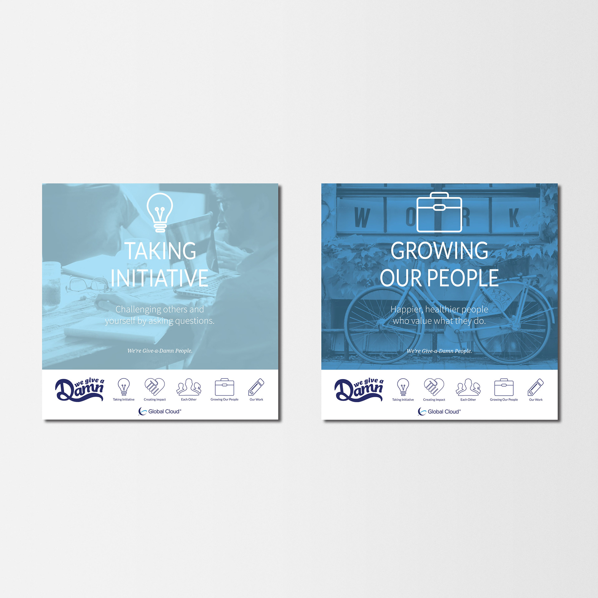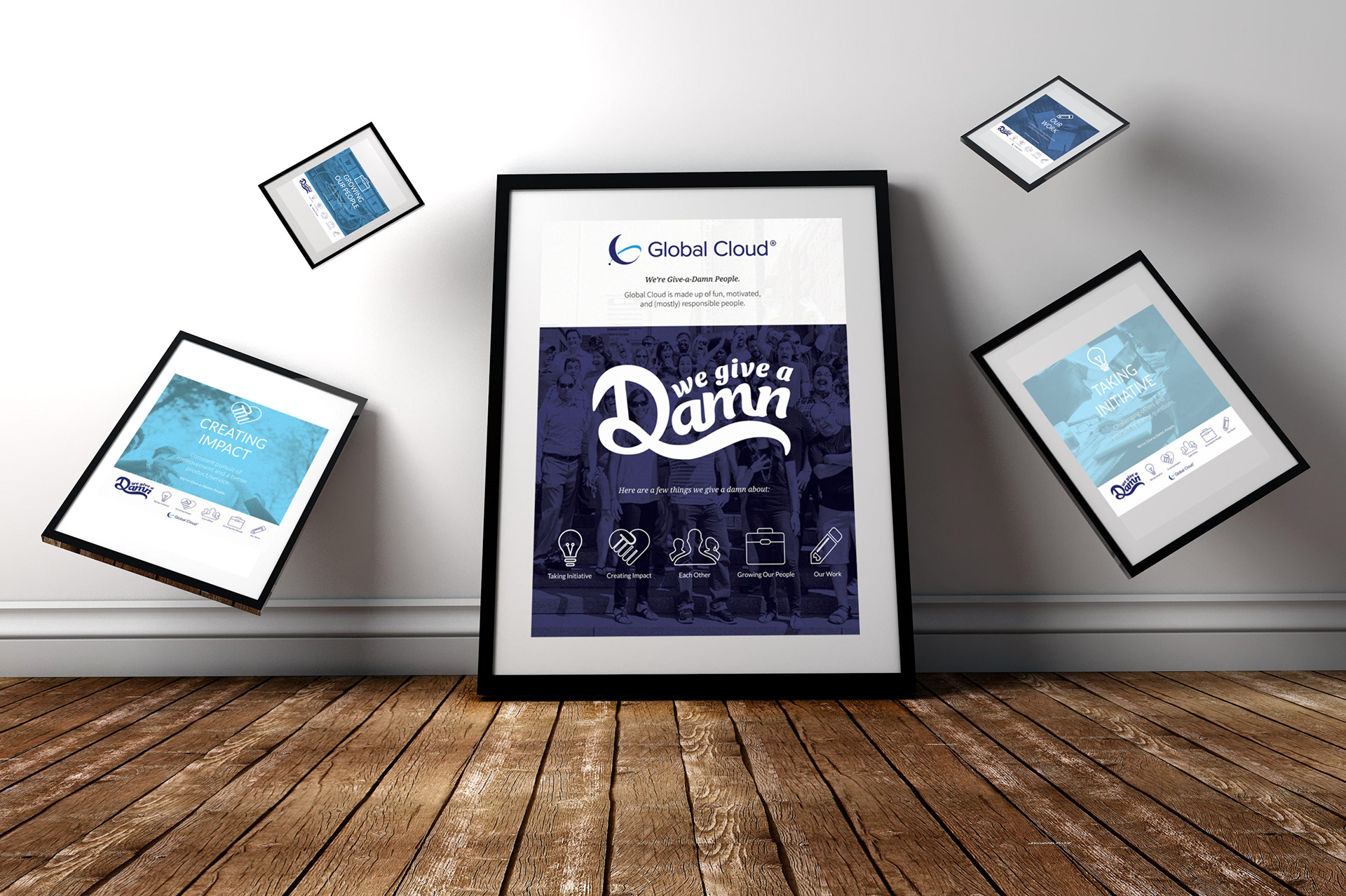 Global Cloud has recently reviewed their mission and values statement and has pulled out key components that relate to who they are as a company. This new Give-a-Damn attitude in relation to their clients and their work has played a large role in their marketing strategy as “Give-a-Damn” people. Re-design the values web and design an entirely new set of company posters for the office space. The values web and poster design should relate to Global Cloud’s newly-designed brand guidelines--mimicking color, type, imagery, and overall esthetic. The Give-a-Damn posters should primarily focus in on their values while still calling attention to their slogan statement. The re-designed values web will be placed on the website and posters will be printed and hung up in the upstairs office space.