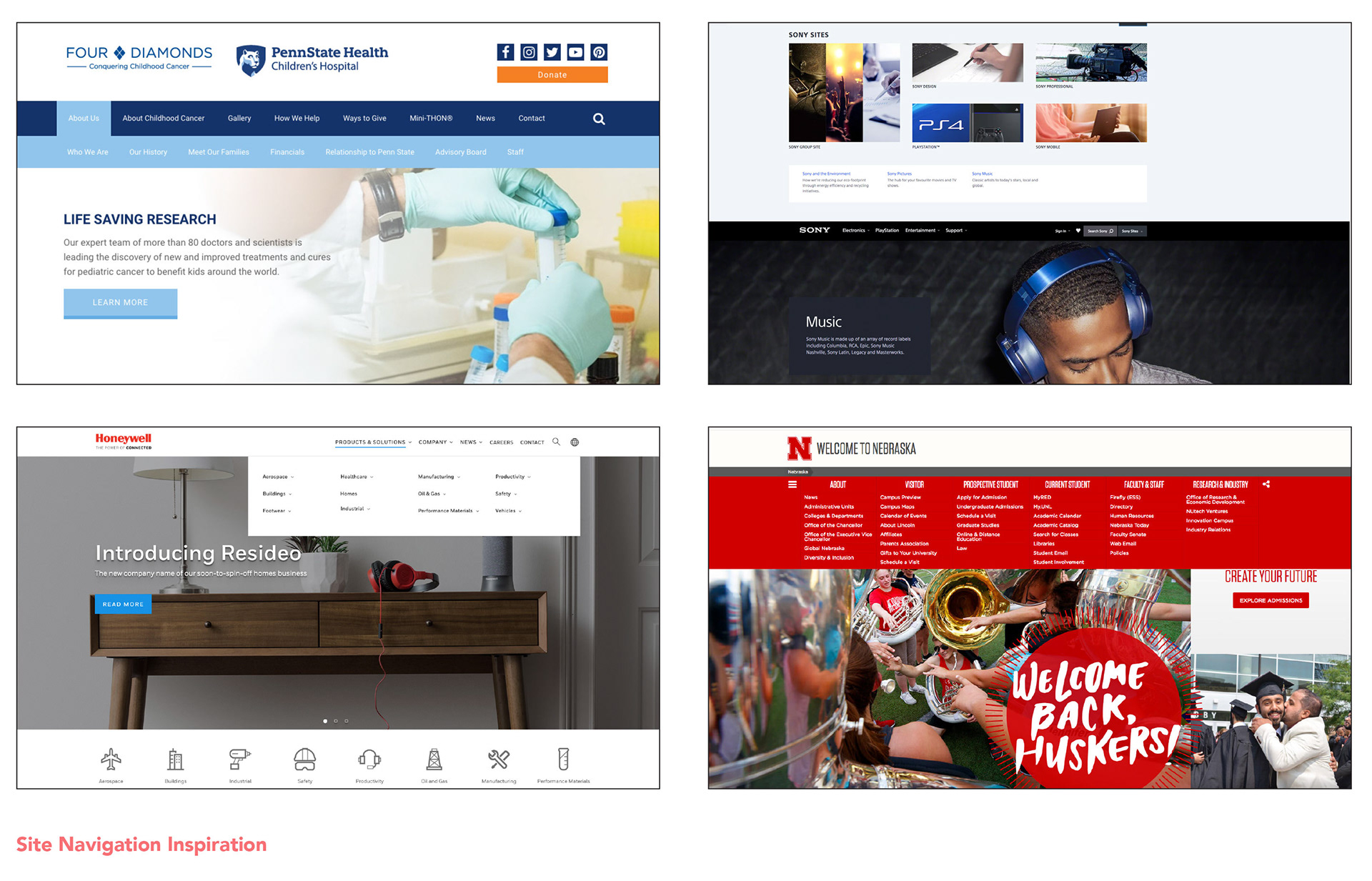 I started with the Four Diamonds site because I liked their horizontal navigation--but I wanted to find sites that used horizontal navigation to contain a lot of content. Websites like Sony and Honeywell had great examples of that, but the best sites that I found that handled this navigation treatment well were college websites.