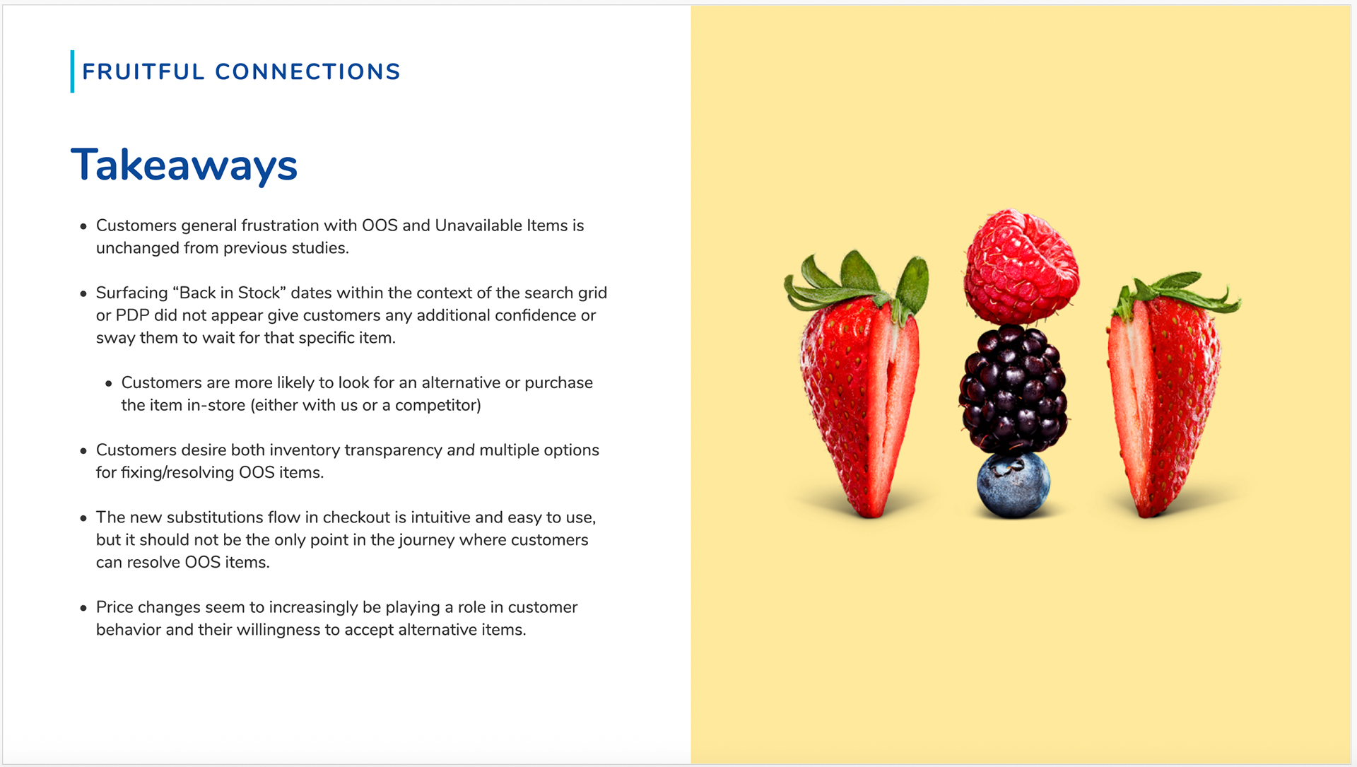 For OOS experiences in other parts of the experience, customers found adding substitutions easy and effective and found the new enhanced experience to be intuitive. However, some customers expressed that they wish they new an item was unavailable sooner in the experience than the Cart or Checkout space. They desired transparency sooner so that they could have better control & visibility of alternatives.