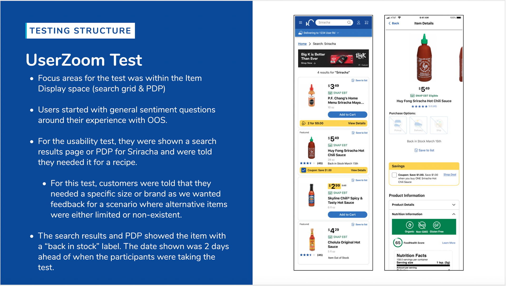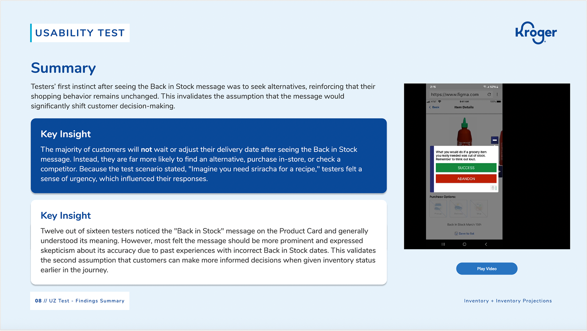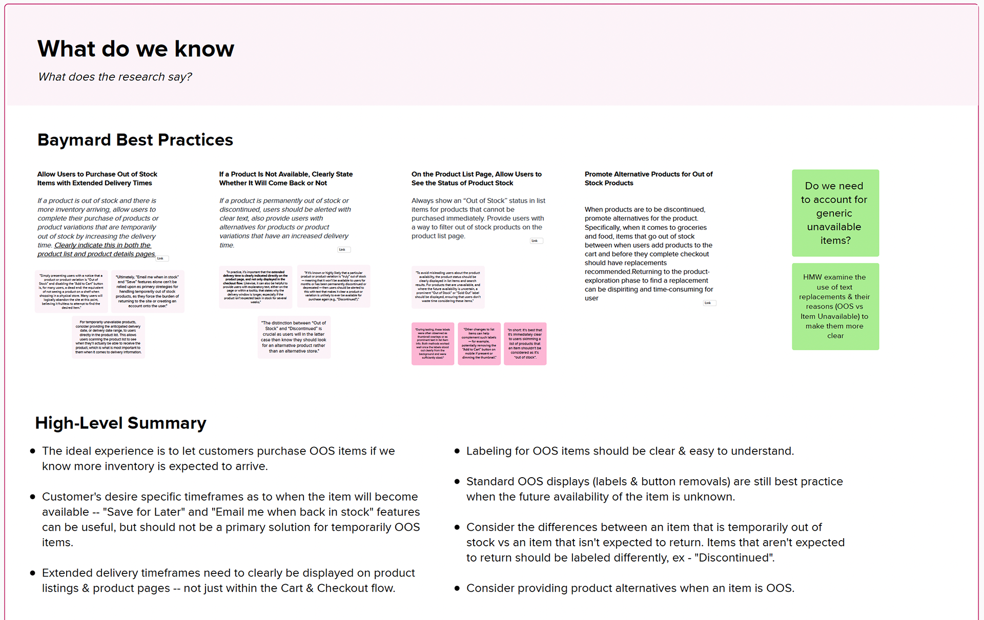 Then we had the opportunity to moderate 5 customer interviews with the help of the user research team. This allowed us to dive deeper into their responses and also cover a few different entry points for inventory including proposed addition of back in stock dates on product card and the enhanced Cart + Checkout substitutions experience.