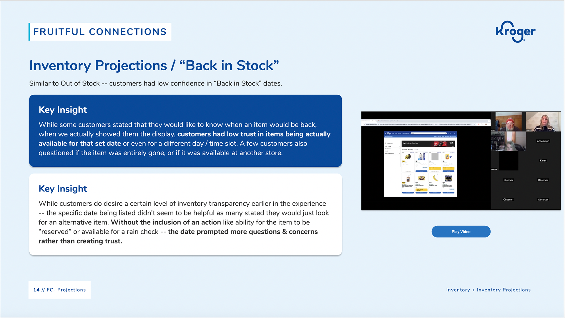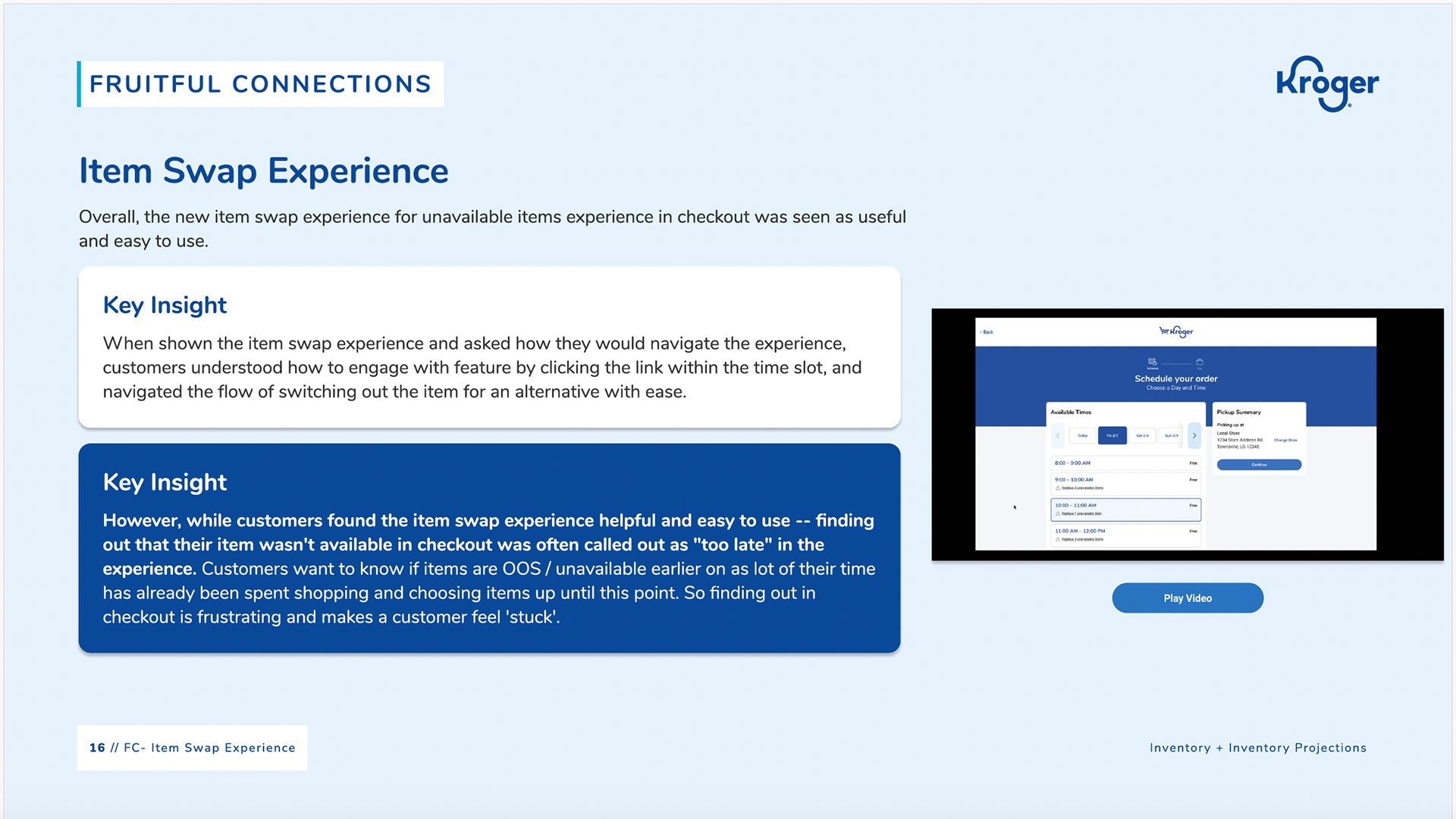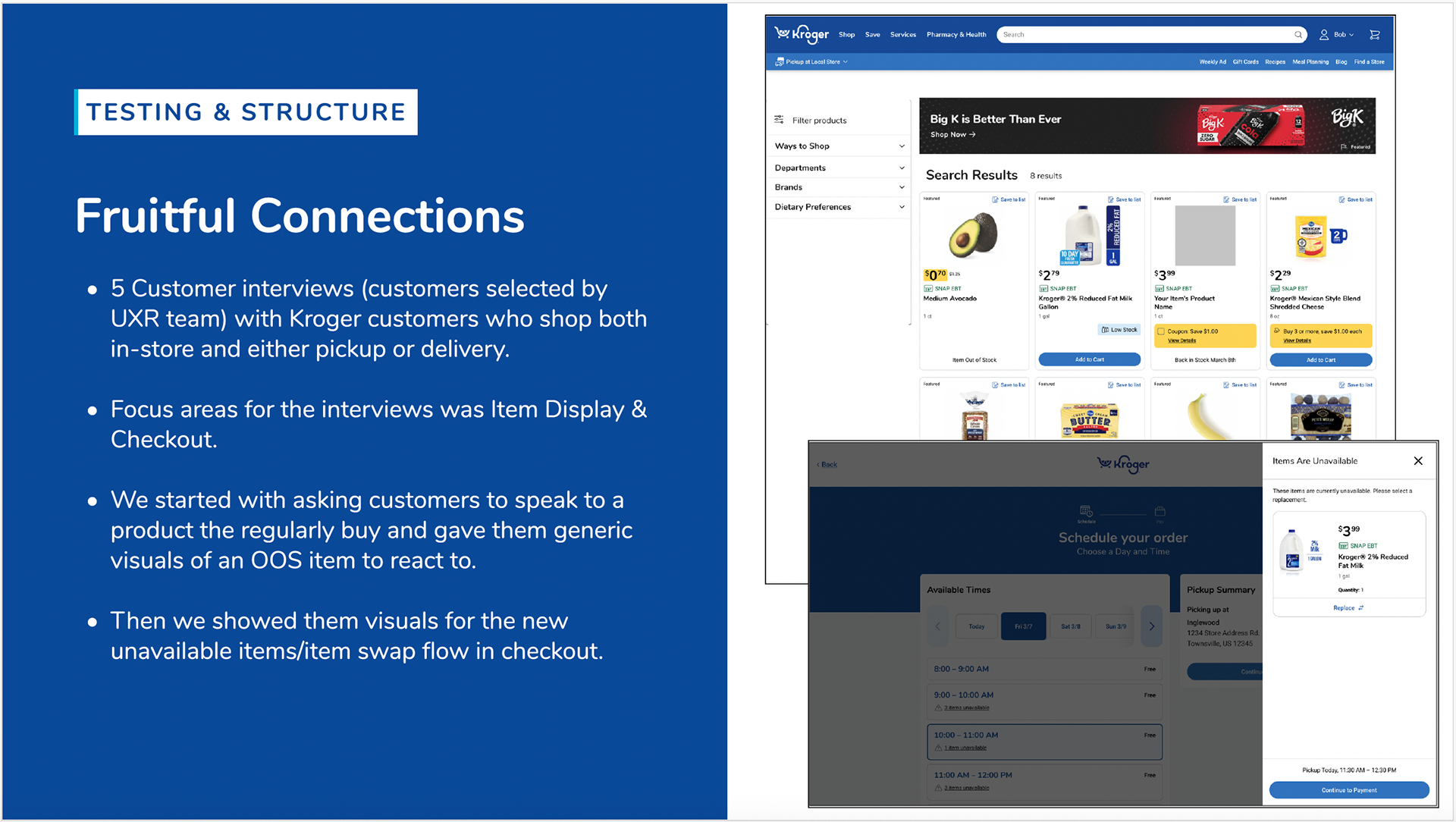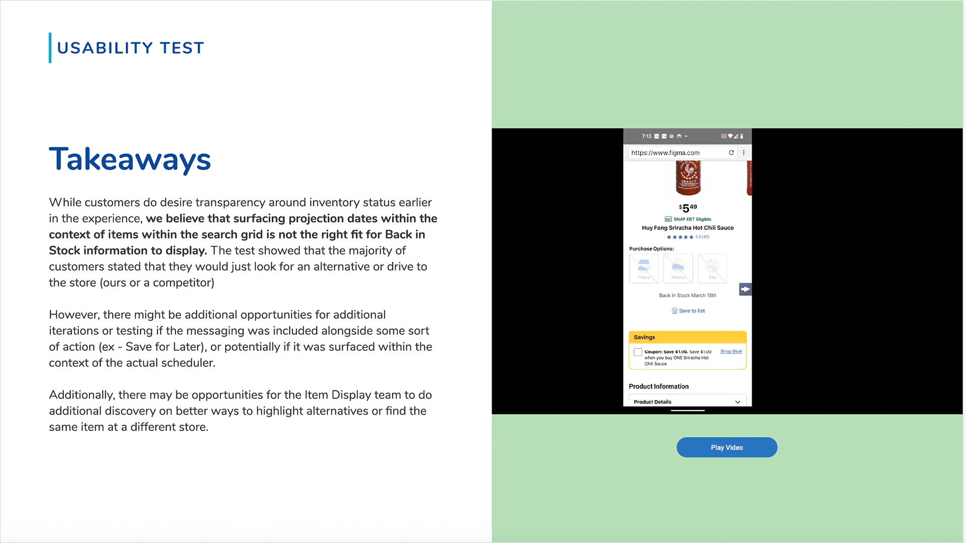 Then we had the opportunity to moderate 5 customer interviews with the help of the user research team. This allowed us to dive deeper into their responses and also cover a few different entry points for inventory including proposed addition of back in stock dates on product card and the enhanced Cart + Checkout substitutions experience.