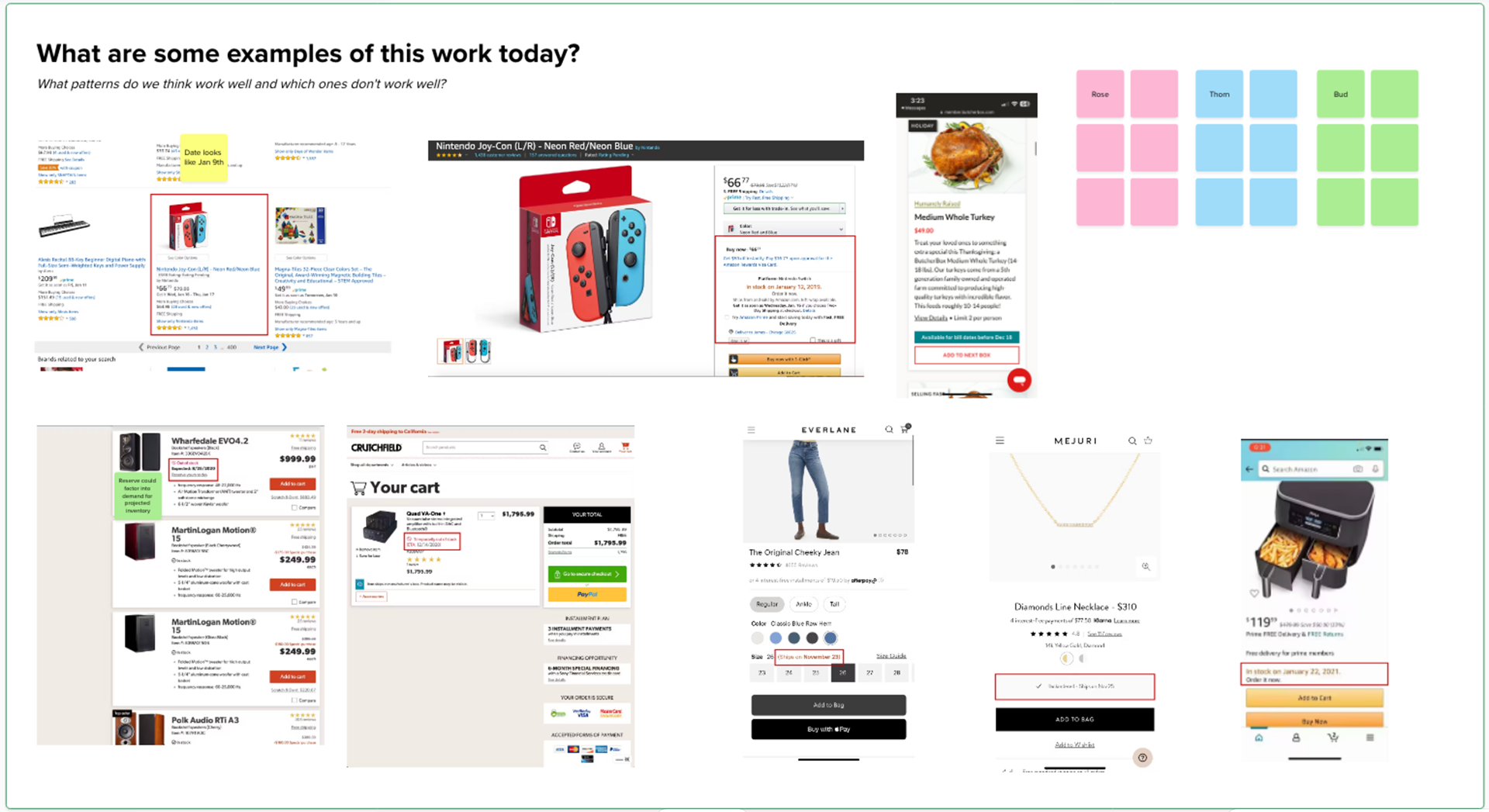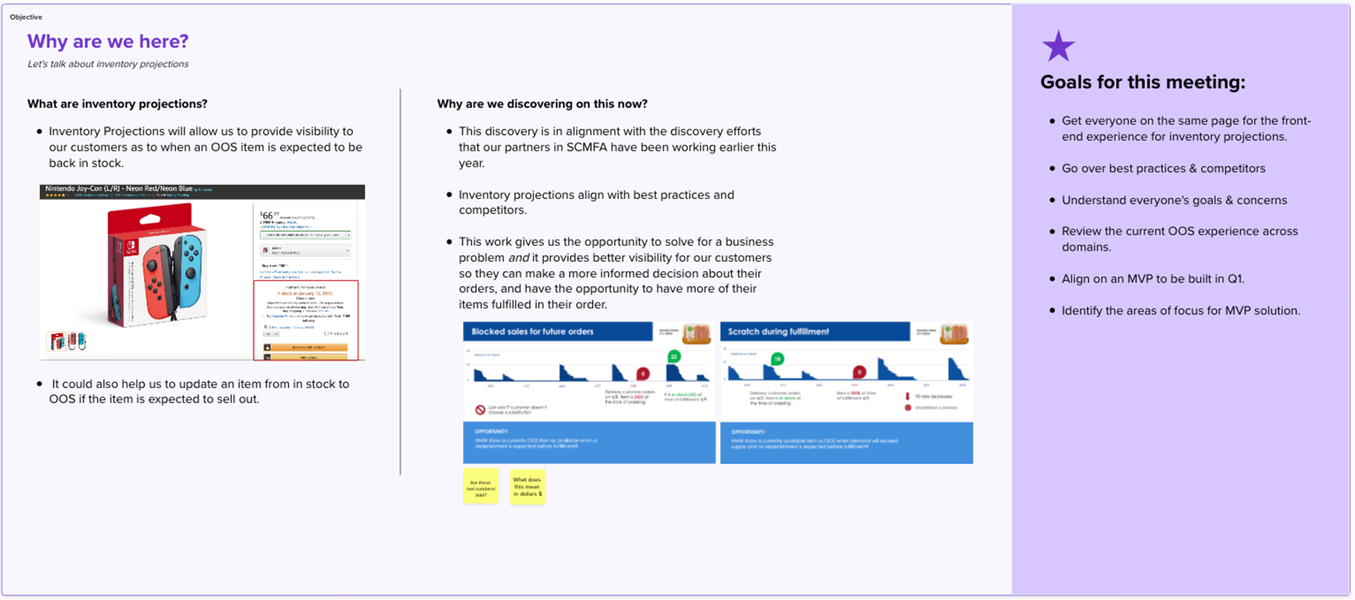 With the teams aligned on bringing our efforts together, I kicked off phase 1 of our discovery with representatives from all 5 teams. In our kickoff we focused on level setting on understanding the new data service (Inventory Projections) being provided by the Available to Promise team, and how we could utilize this new capability to provide a better experience for our customers in a cohesive way.