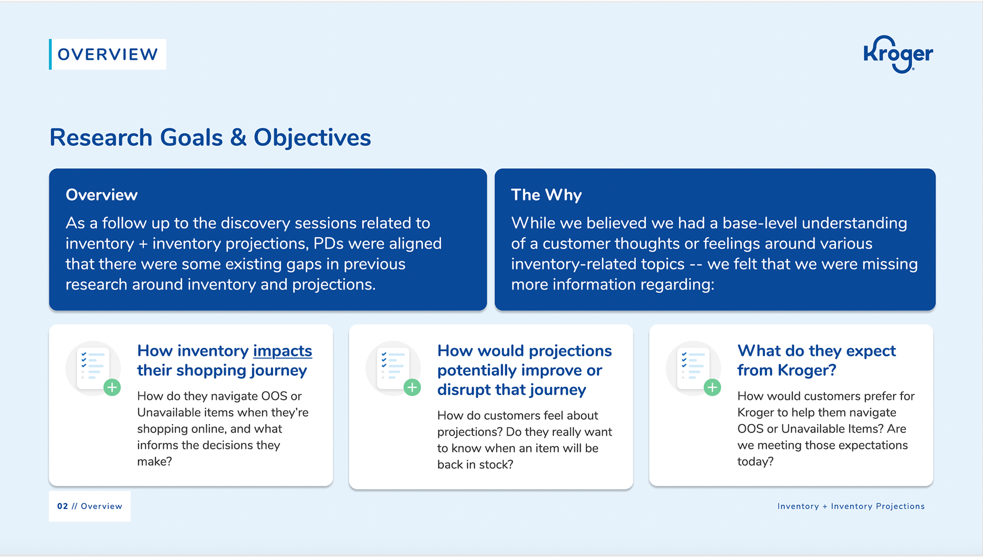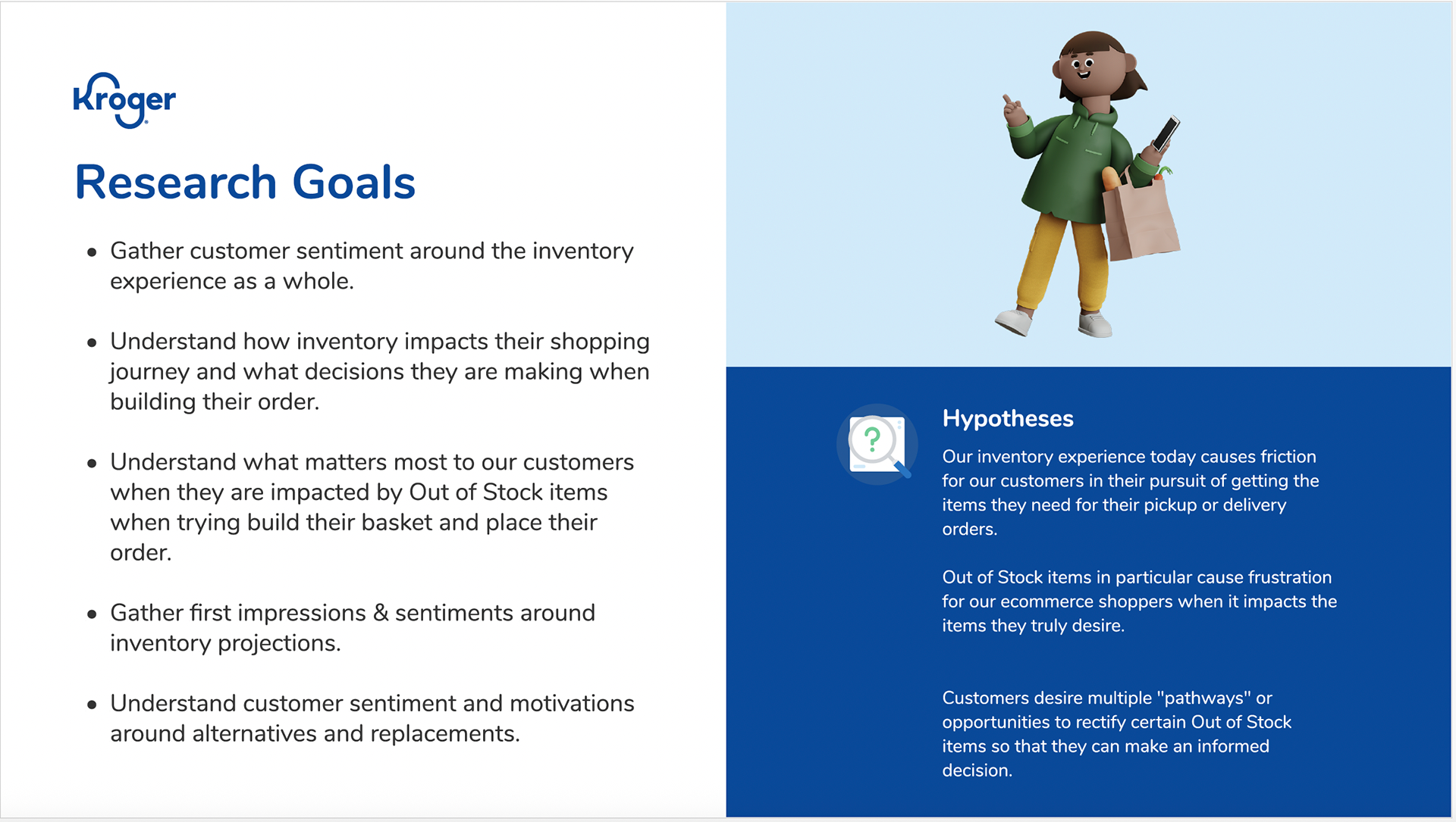 We began with understanding how the service could be brought to the front end, what best practices say today, what our hopes & fears were, and the beginnings of a roadmap of how we would complete discovery and move on to testing. At the end of the kickoff, it was decided that this initial effort would be focused on the customer experience around Out of Stock Items.
