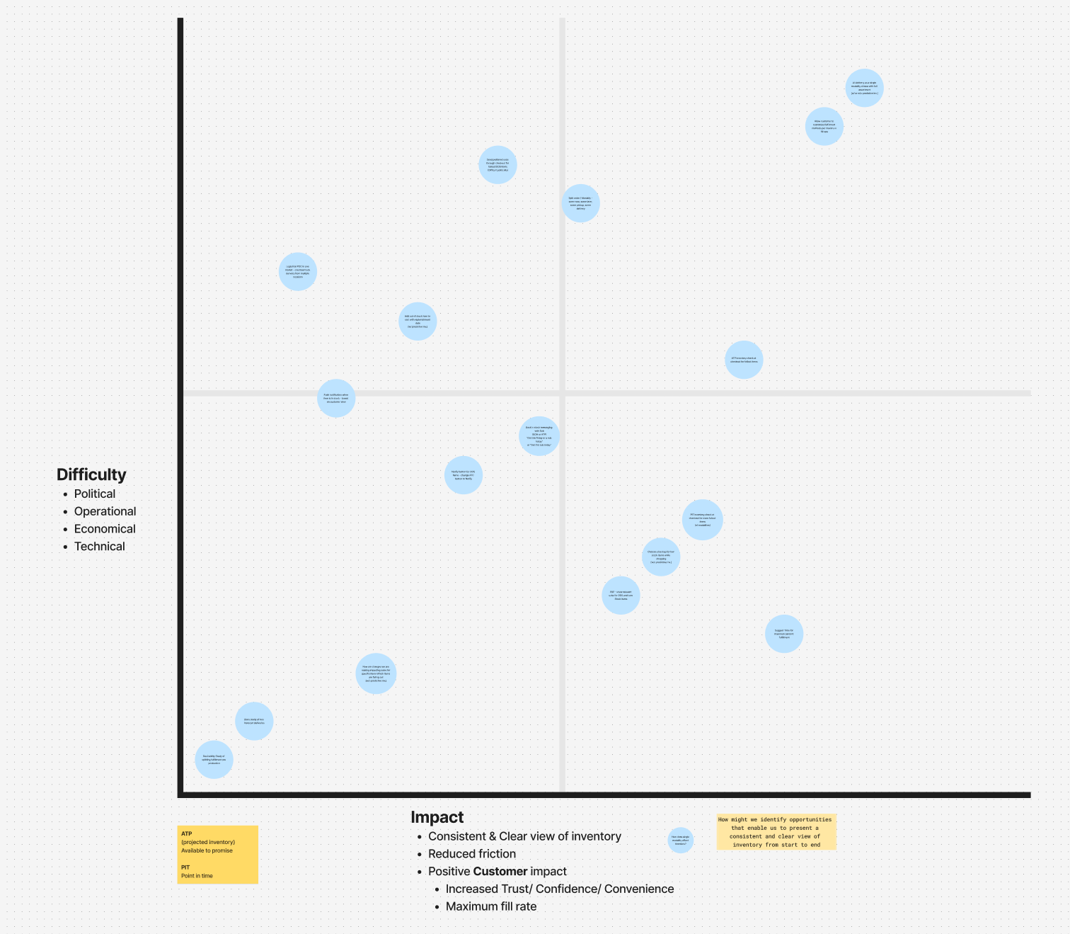 From this discovery, we compiled a list of ideas & features to test or gather additional research on. Utilizing a difficulty matrix, each team championed a particular idea to focus their test & learn efforts on. Item Display (my team) chose to focus on surfacing substitutions for low stock items, Checkout & Post Order focused on substitutions for out of stock items, and the available to promise team focused on enhancing inventory projection capabilities.