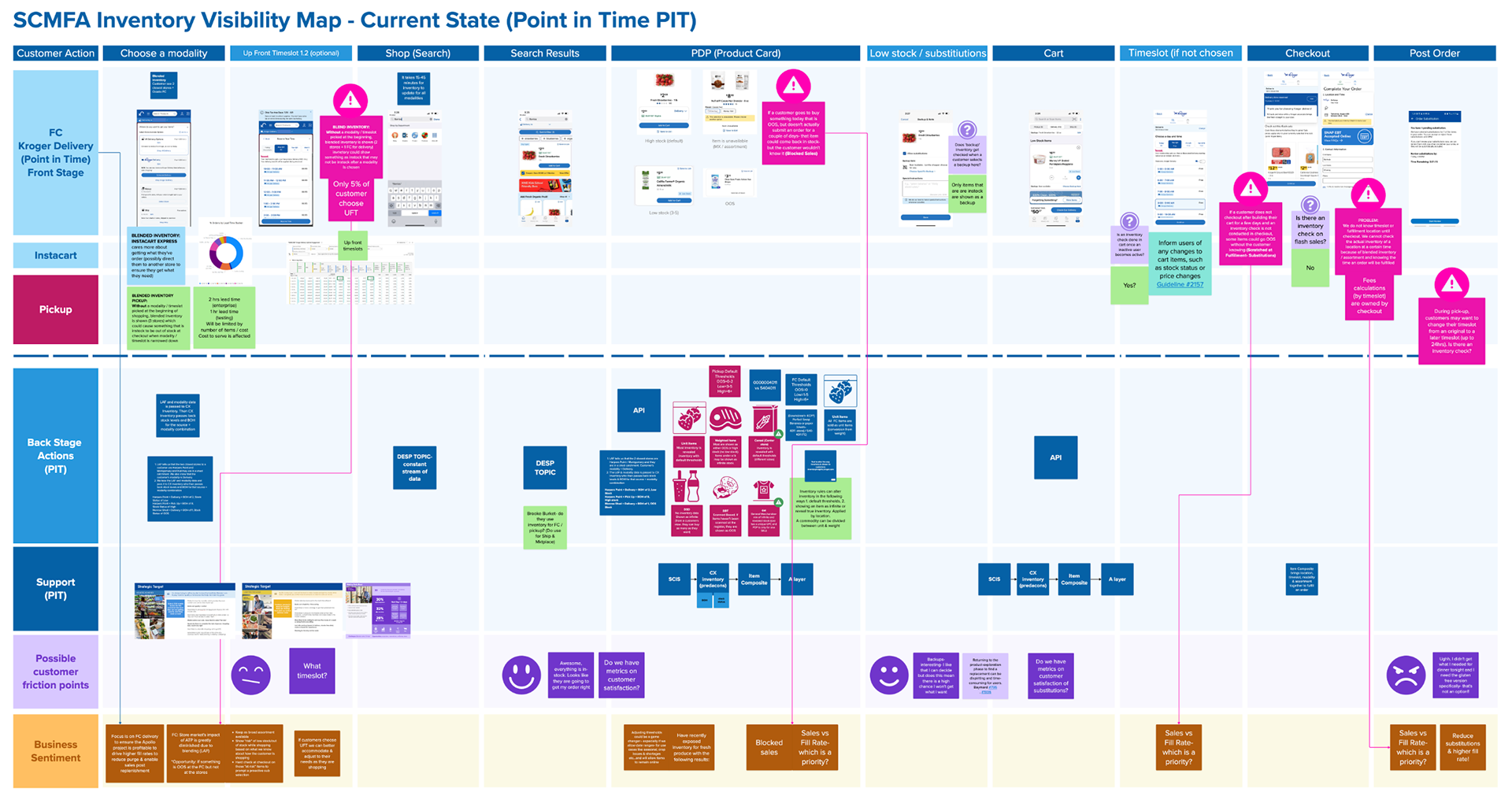 Inventory Experience service blueprint at the time of initial discovery (created by Nichole Chaney, PD on Available to Promise Team). Their team ran the back end service that impacted the front end teams across Item Display, Cart, Checkout, & Post Oder.