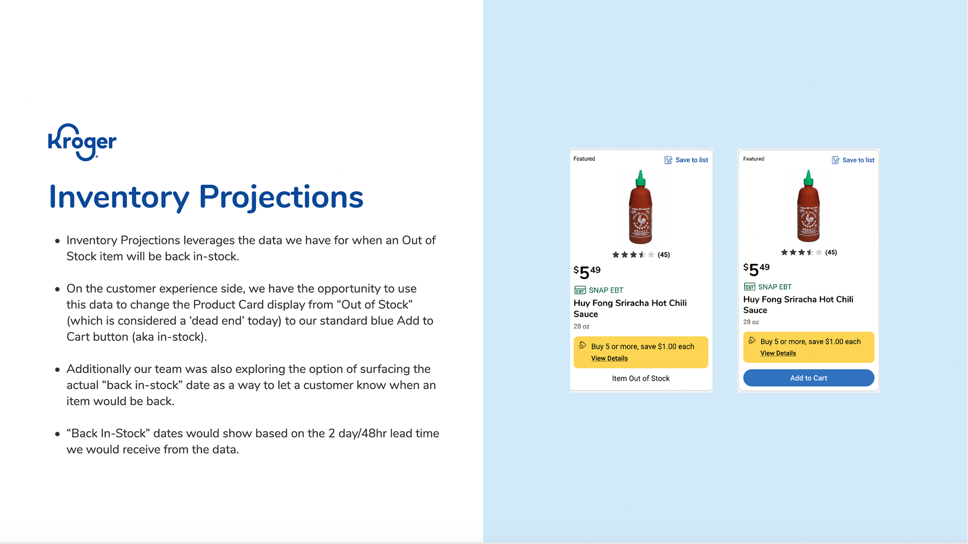 For example, if a customer is shopping online with us on a Wednesday (when an item is currently out of stock), but they are scheduling their order for Friday (when the item is expected to be back in stock), we would leverage that available data to make the item appear available to our customer and allow them to add to cart.