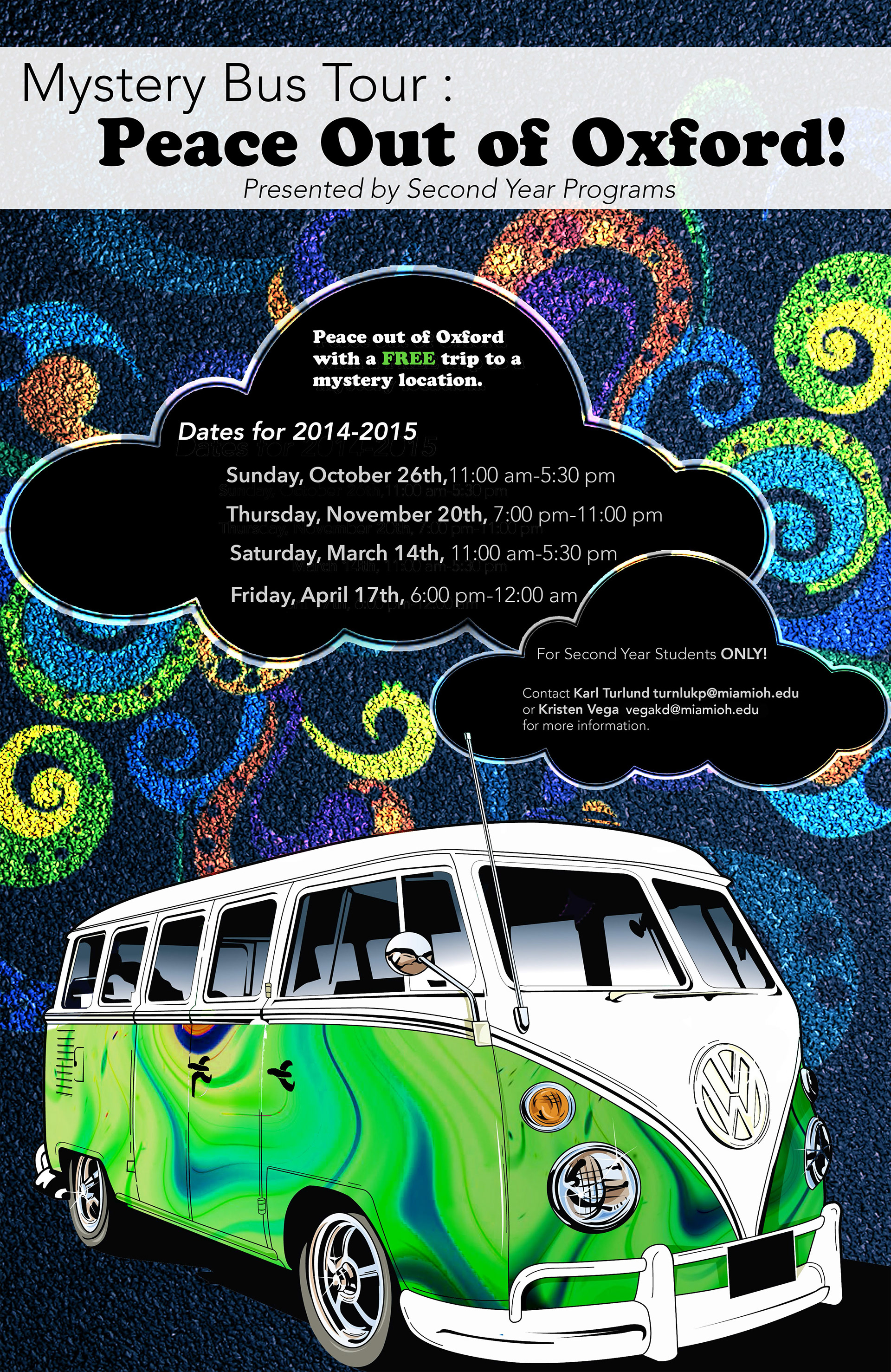I was asked by the Second Year Programs Committee to create a poster design for the Mystery Bus Tour. All posters were printed and distributed in residence halls across campus.