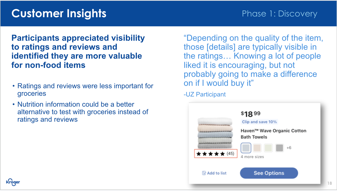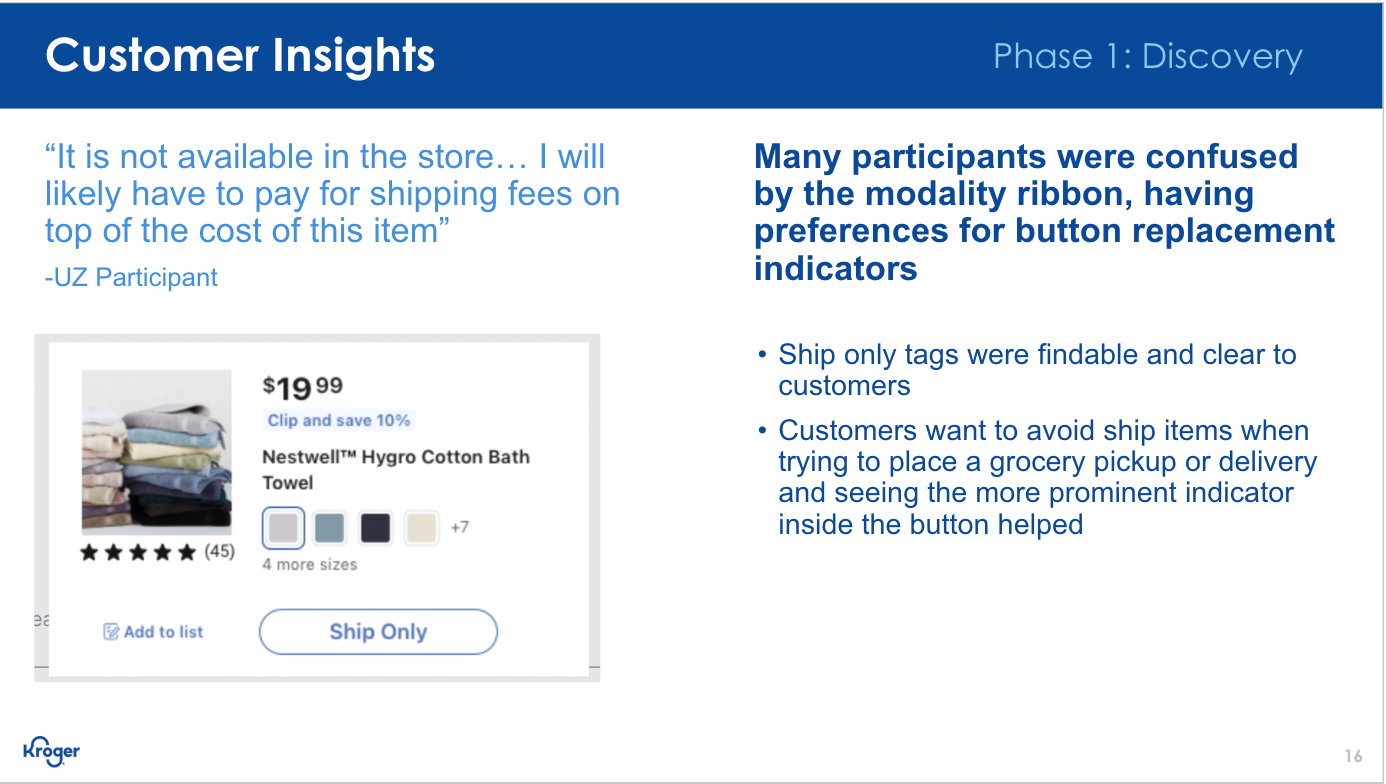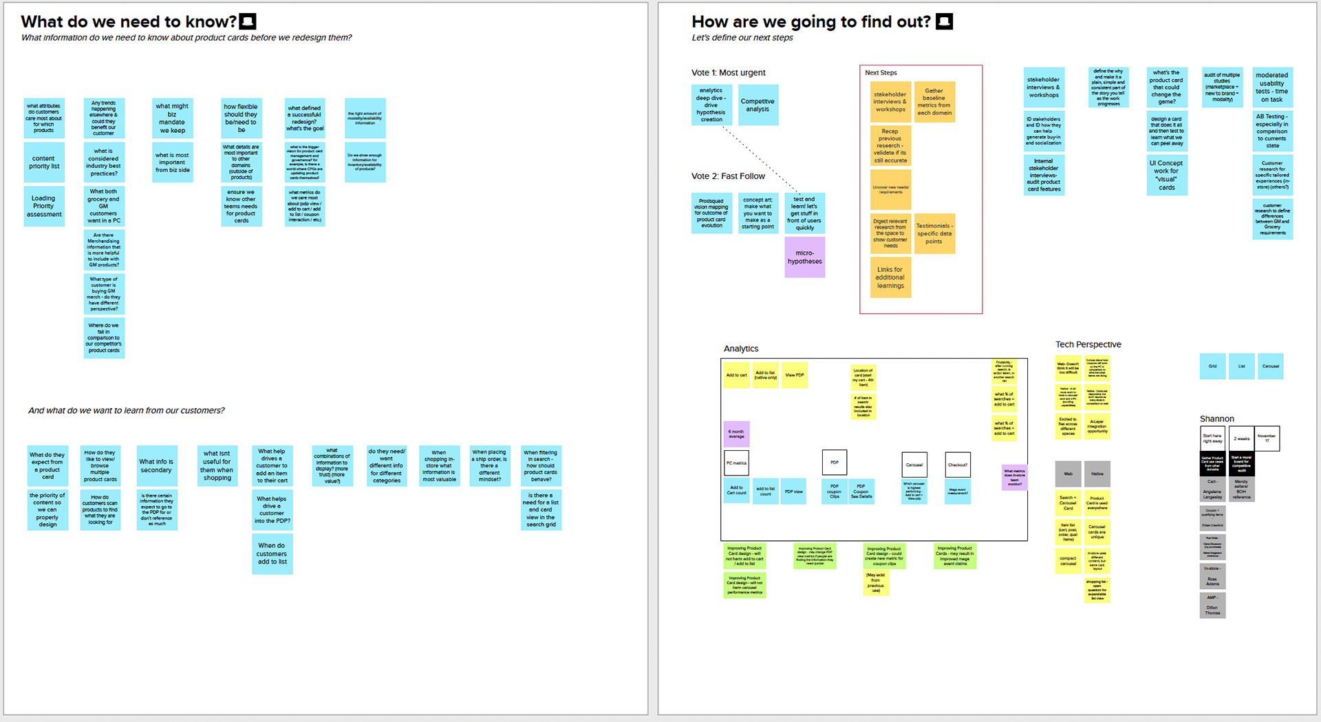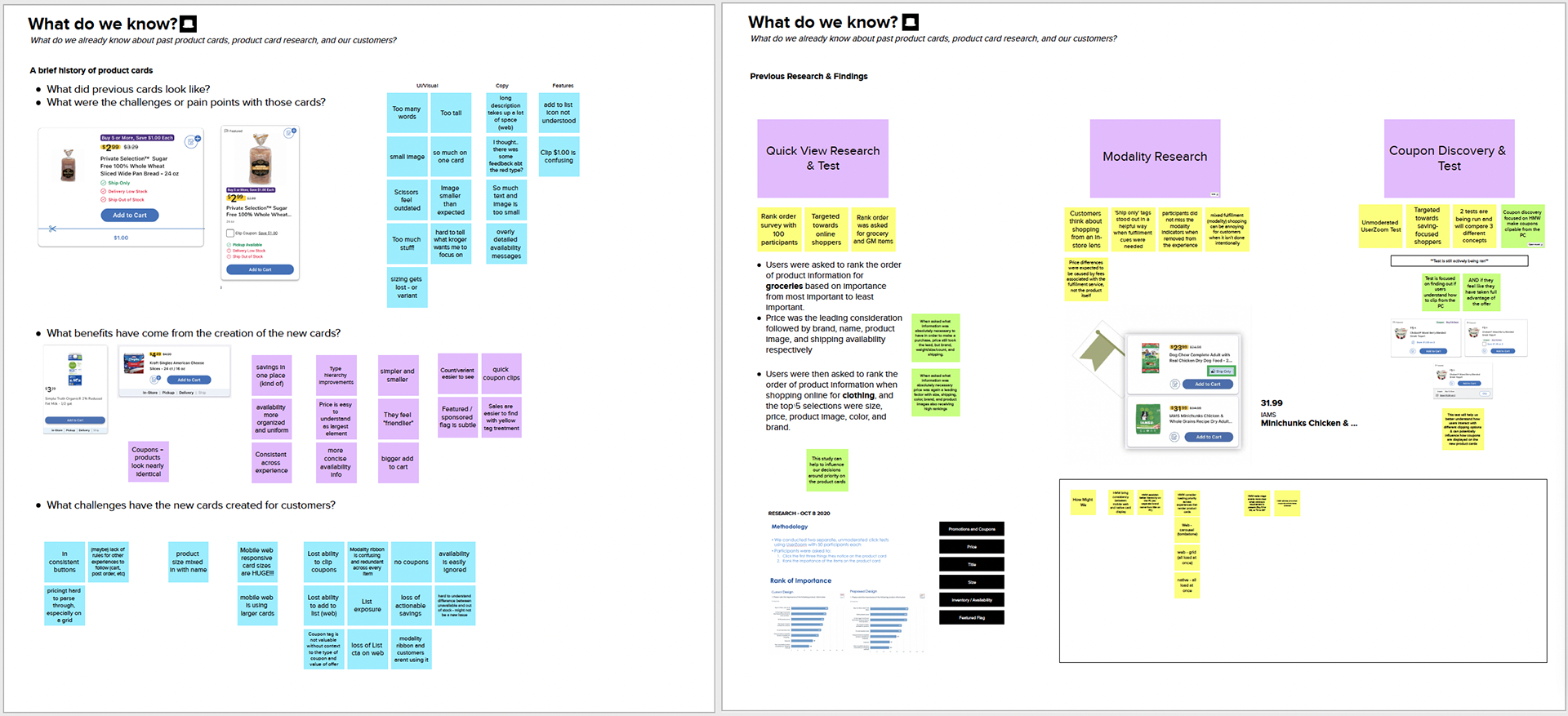 Our team was given the space to run a design discovery on the future of product cards. Discovery began with an initial kickoff that outlined what we currently understood about our cards and the many changes they had been through over the years to get to where we were. By outlining what we already knew from previous research, related discoveries & research (fulfillment & coupons), upcoming business requests on the horizon (ratings & reviews and item variants), we were able to focus on filling in the gaps to better understand what our customers want & need.
