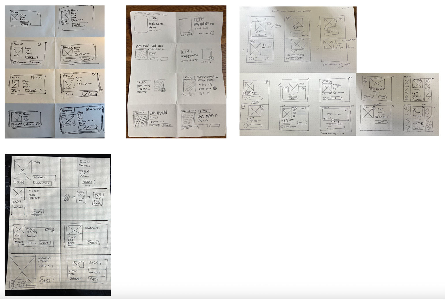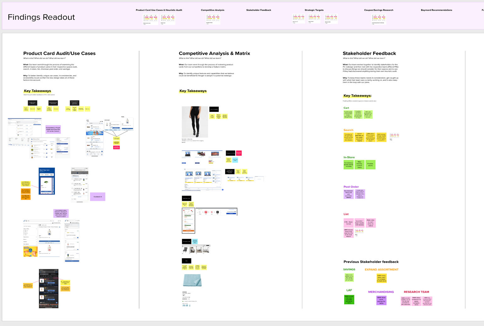 After the discovery kickoff was complete, we felt like we needed a more wholistic view of the cards and where we could take them in the future. So over the course of several weeks we ran audits of all of the variations of product cards, looked at what competitors were doing, spoke to stakeholders, spoke to other designers about their related research, and combed through best practices from Baymard.