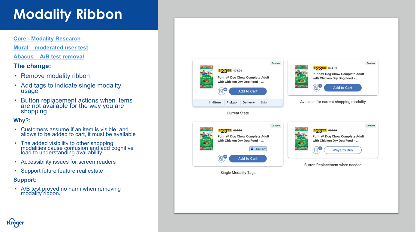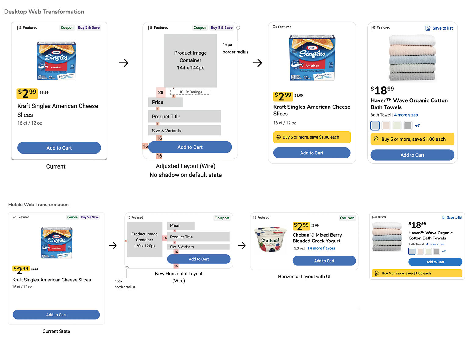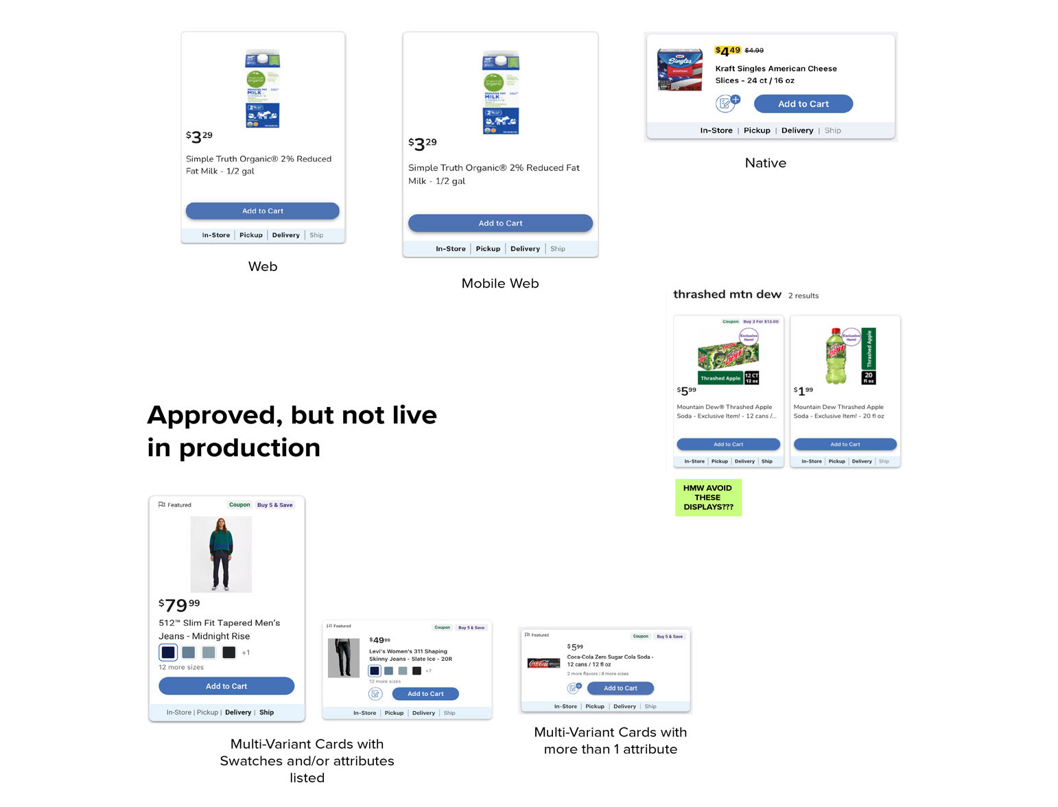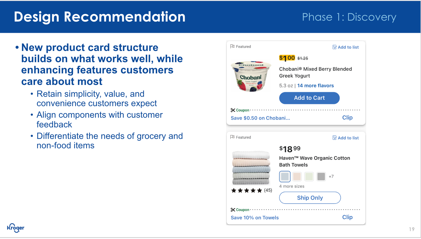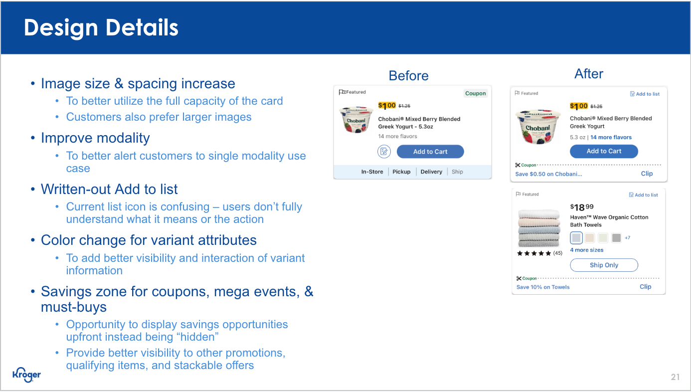 Both Web (Desktop & Mobile) and Native received the various updates we highlighted. With the previous mockups having already gone through usability testing, we focused on refining UI elements so that they better aligned with Kroger's overarching design system and patterns.