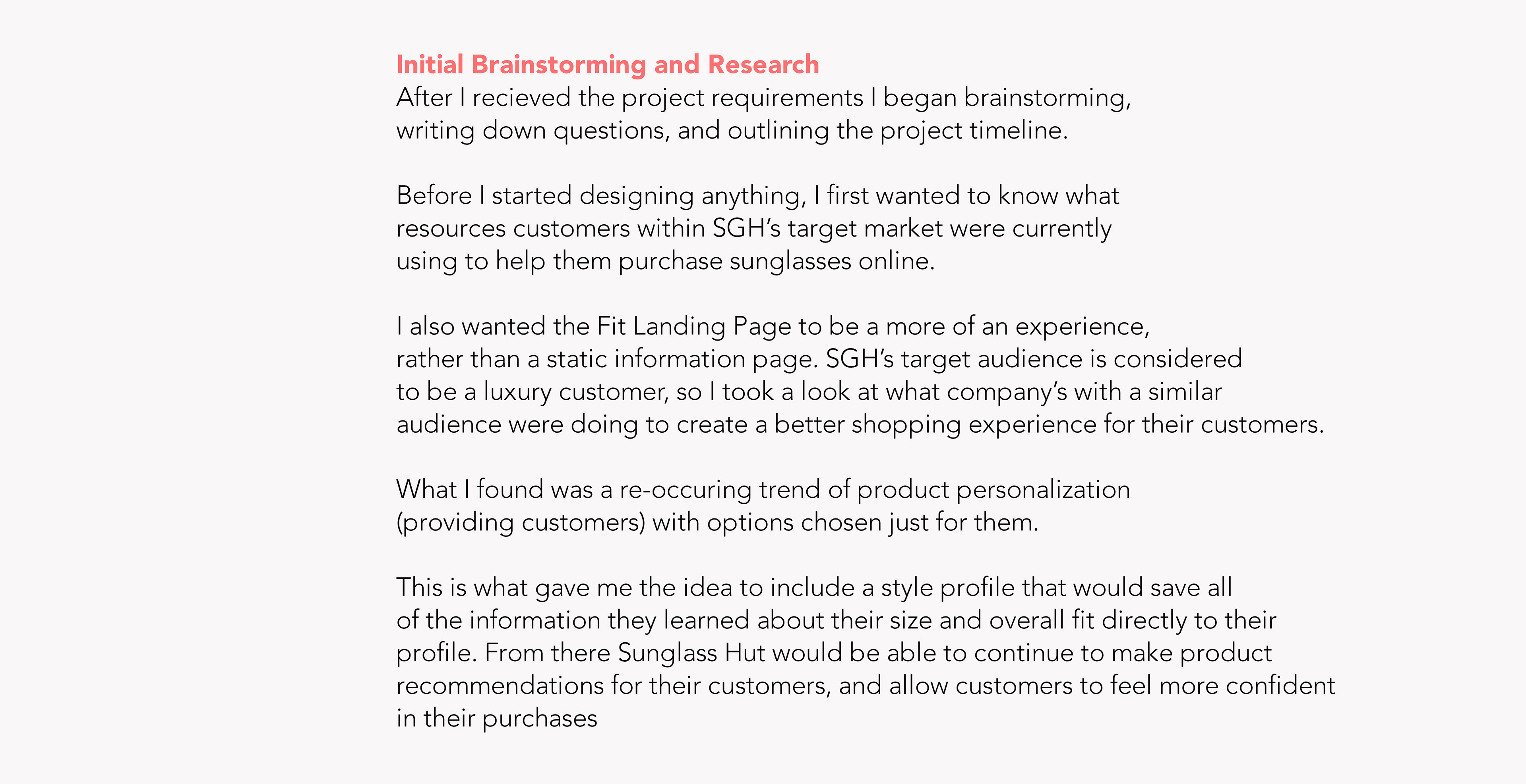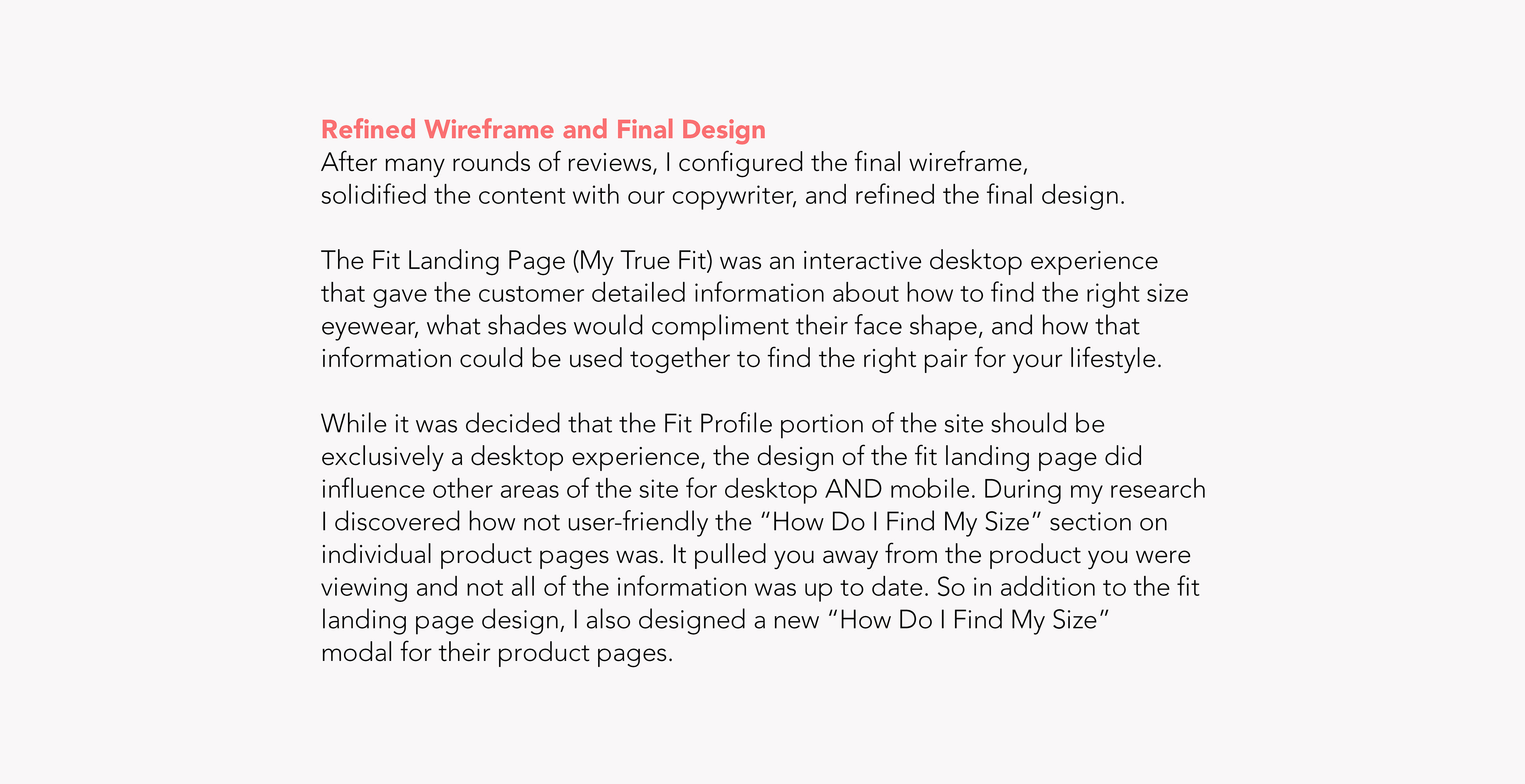 Designed new fit landing page for Sunglass Hut's website. The landing page was used as an educational tool to help customers find the right fit for their face shape, lifestyle, and actual size. The desktop landing page also included a personal fit profile for new and returning customers alike. Check out live demo here : https://invis.io/BUNMXU9Q8SW
